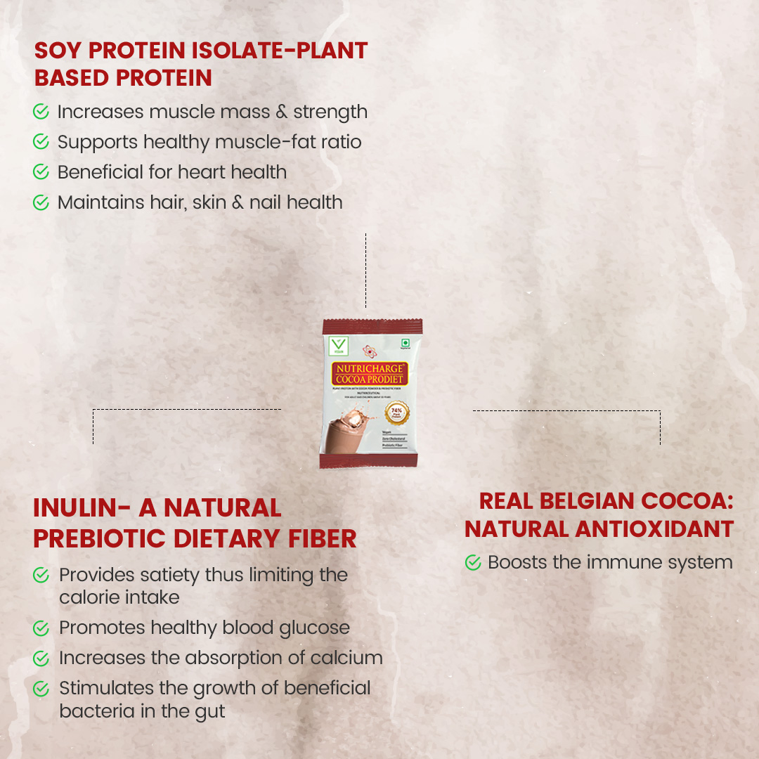 Nutricharge Cocoa Prodiet provides 74% high quality vegan soy protein that primarily helps maintain & increase muscle mass and strength. It helps balance healthy muscle- fat ratio and preserve ageing muscles. It is beneficial for bone health, heart health, immunity, stamina, metabolic health such as reducing glycaemic response and managing weight. It also helps maintain hair, skin and nail health.