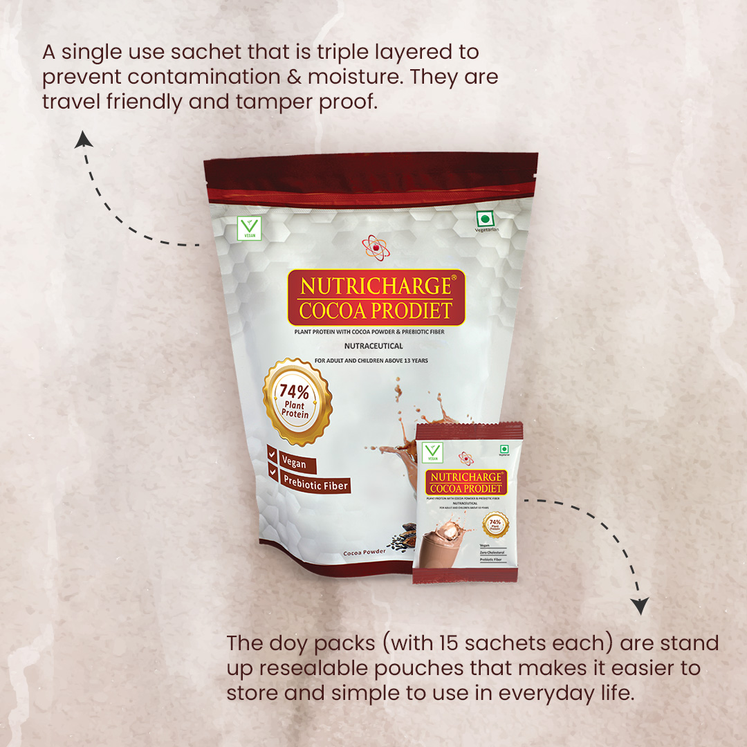 Indian diets derive almost 60% of their protein from cereals (like wheat, rice) with relatively low digestibility and quality. Cereals and Legumes, which form the major part of the Indian diet are known as “incomplete proteins”/ “low quality proteins” as they do not have all the essential amino acids. Therefore, it is important to fulfill the protein deficiency with Nutricharge Cocoa Prodiet.
